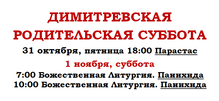 Димитриевская родительская суббота – ближайшая суббота перед днем памяти св. великомученика Димитрия Солунского (26 октября / 8 ноября). Установлена после битвы на Куликовом поле. Первоначально поминовение совершалось по всем воинам, павшим в этом сражении. Постепенно Димитриевская суббота стала днем заупокойного поминовения всех усопших православных христиан.