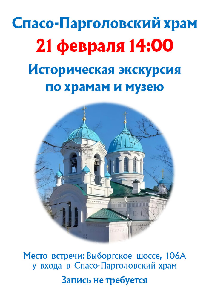 В субботу, 21 февраля, в 14:00 приглашаем на обзорную экскурсию, посвященную истории Спасо-Парголовского храма!