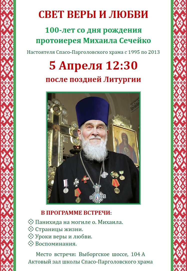 100 ЛЕТ СО ДНЯ РОЖДЕНИЯ ПРОТОИЕРЕЯ МИХАИЛА СЕЧЕЙКО