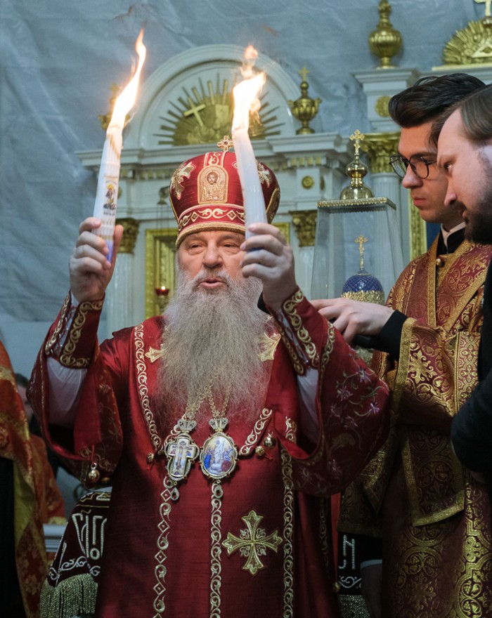 В храм был доставлен Благодатный огонь из Иерусалима, частицы которого прихожане унесли в свои дома.