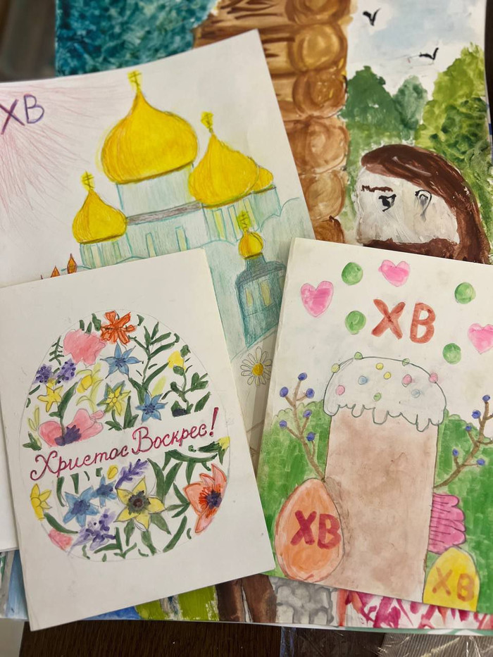 Замечательные открытки, которые отправятся на фронт и подопечным в колонии, рисунки, участвующие в пасхальном конкурсе «Родника», - все сохранено в наших сердцах, в электронном виде и в напечатанных поздравительных открытках от нашего храма.
