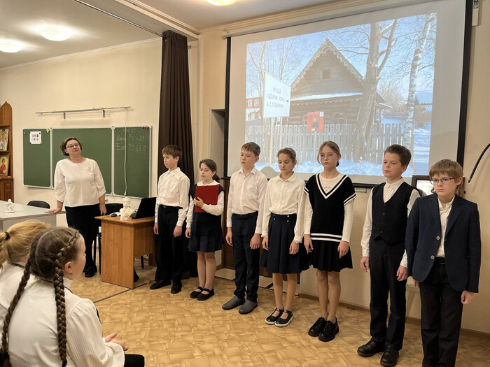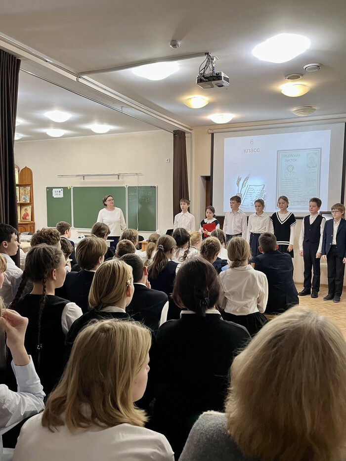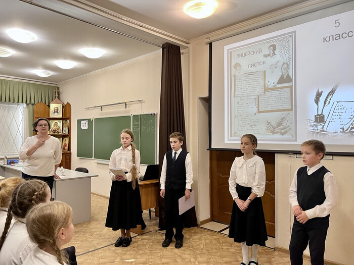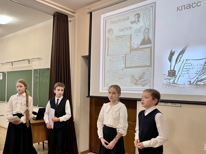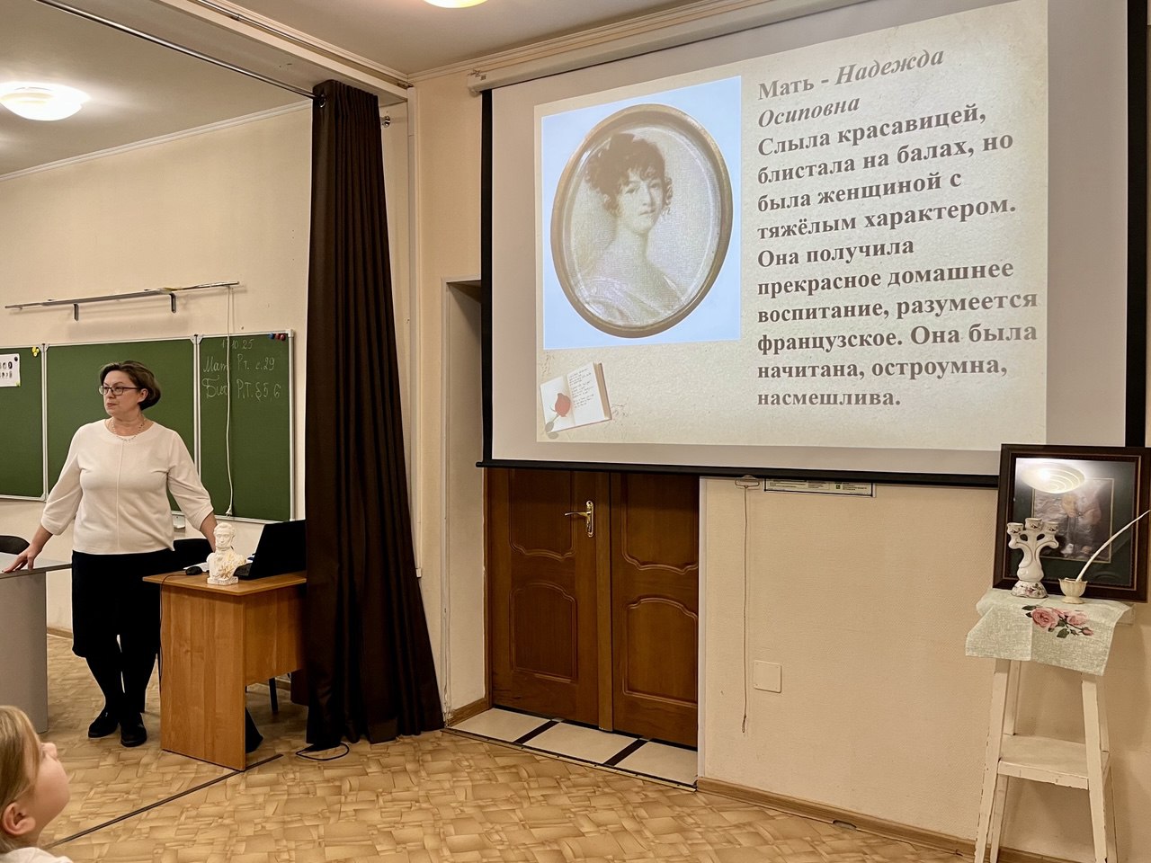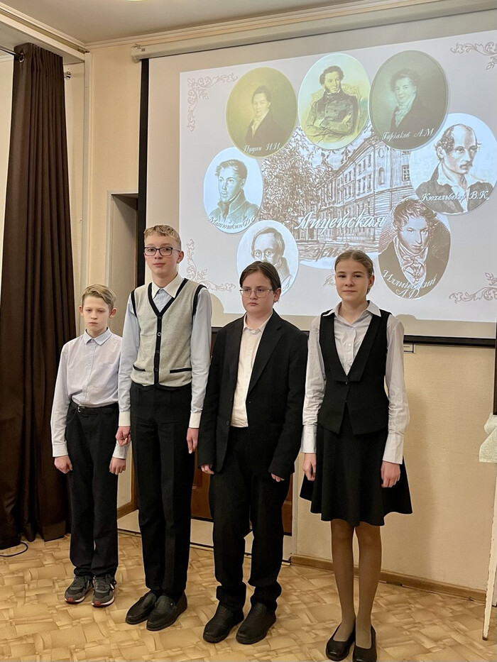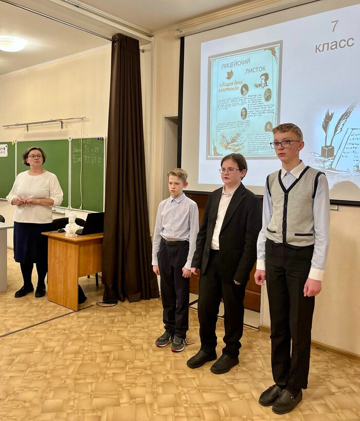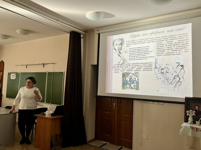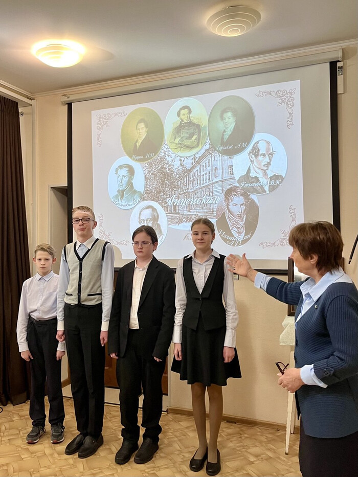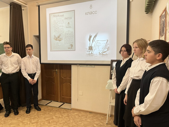 А в школе тем временем… начиналась Литературная гостиная, которую организовала и провела для учеников старшей школы Ольга Николаевна Михайлова, учитель словесности УКЦ «Родник»: «В прошлом году мы с Вами, ребята, очень серьезно знакомились с духовной семьей Саши Пушкина - «Лицейским братством». Ученики 7 класса помогут вспомнить нам некоторых товарищей А.Пушкина «по музе, по судьбам» по средству поэтических воспоминаний, которые они приготовили вместе с А.А. Борисовой. Послушаем! В нынешнем году давайте же отдадим дань памяти семье, с которой связывали поэта кровные узы родства».