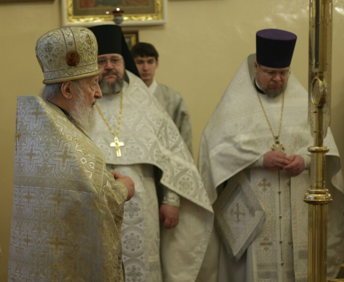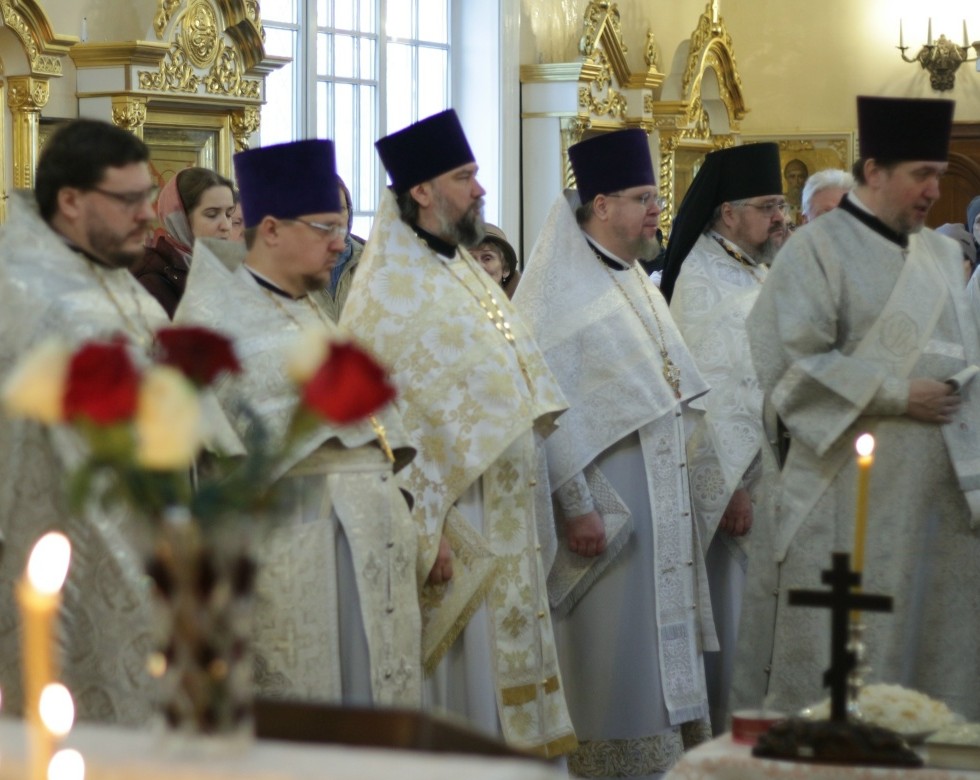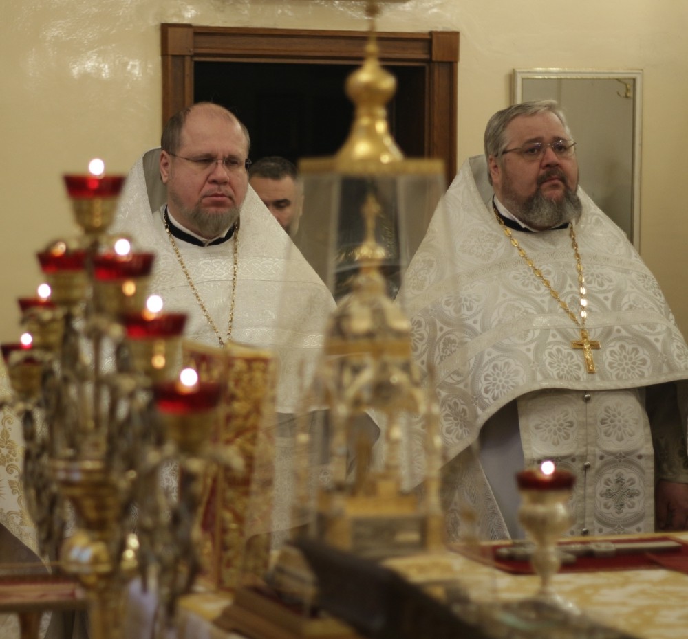 Богослужение возглавил благочинный Выборгского округа протоиерей Александр Будников. Ему сослужили: благочинный Приморского округа иеромонах Александр (Ковальский), настоятель храма великомученика Димитрия Солунского протоиерей Александр Рябков, ключарь Исаакиевского собора, настоятель Спасо-Парголовского храма и храма Всех Святых, в земле Санкт-Петербургской просиявших протоиерей Роман Ковальский, настоятели храмов Приморского благочиния и другие священнослужители.