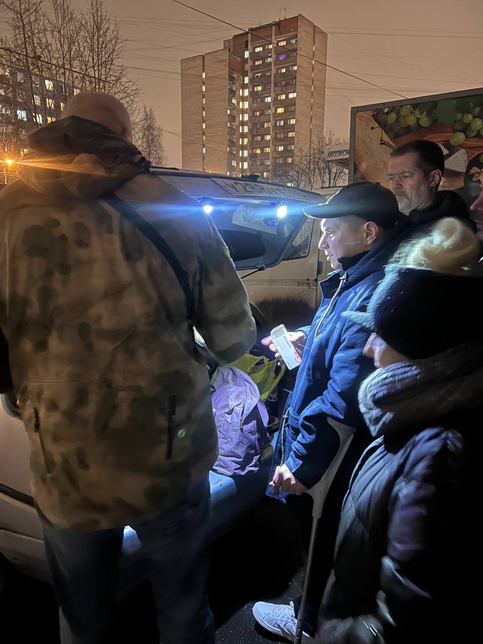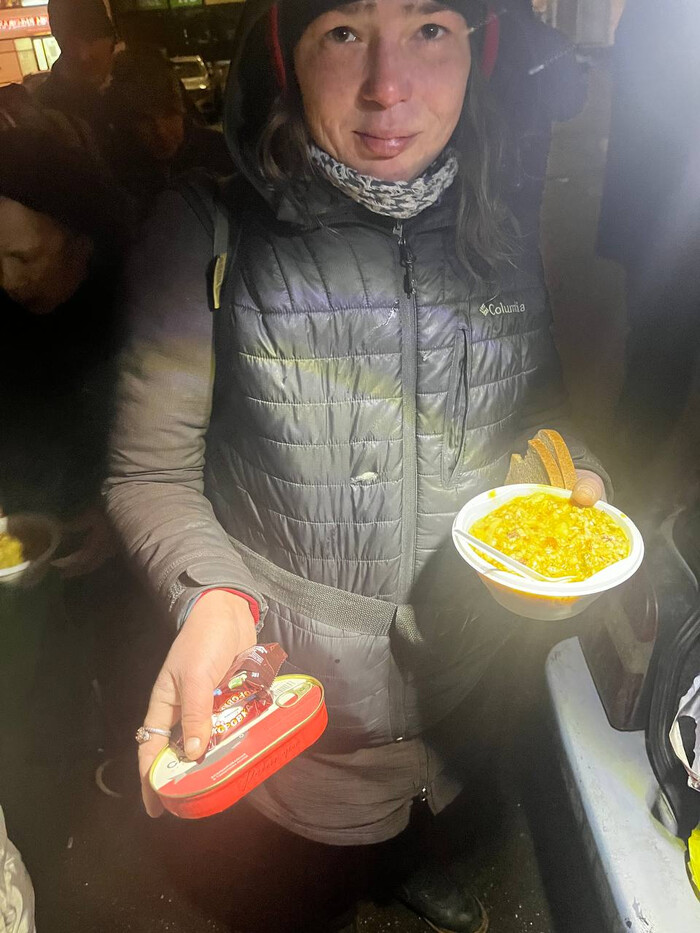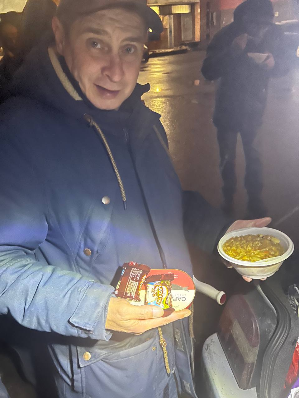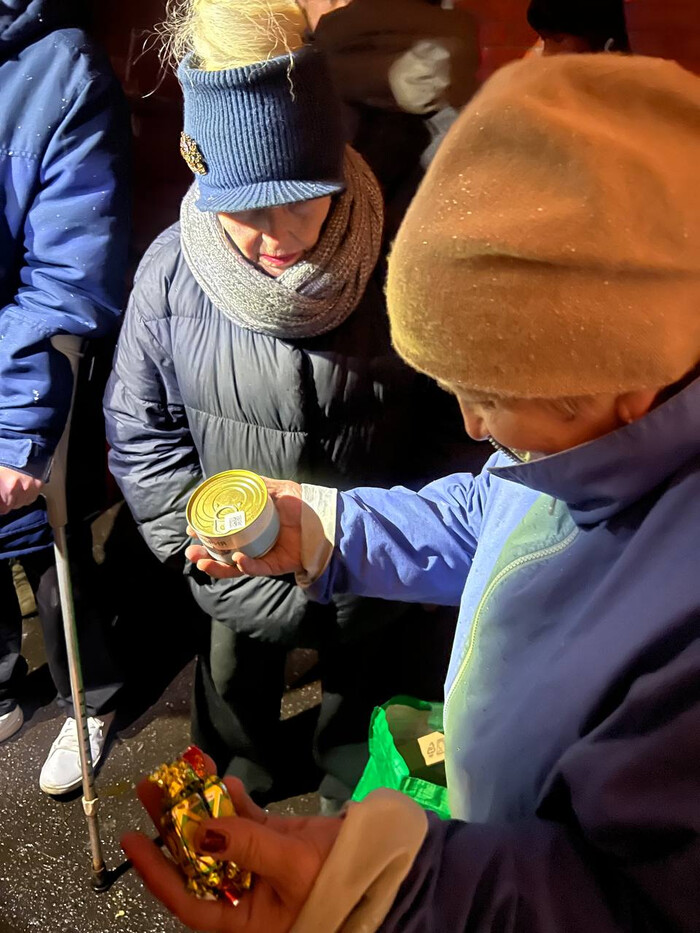 На кормлении бездомных раздавали пожертвованные консервы и конфетки в честь праздника.