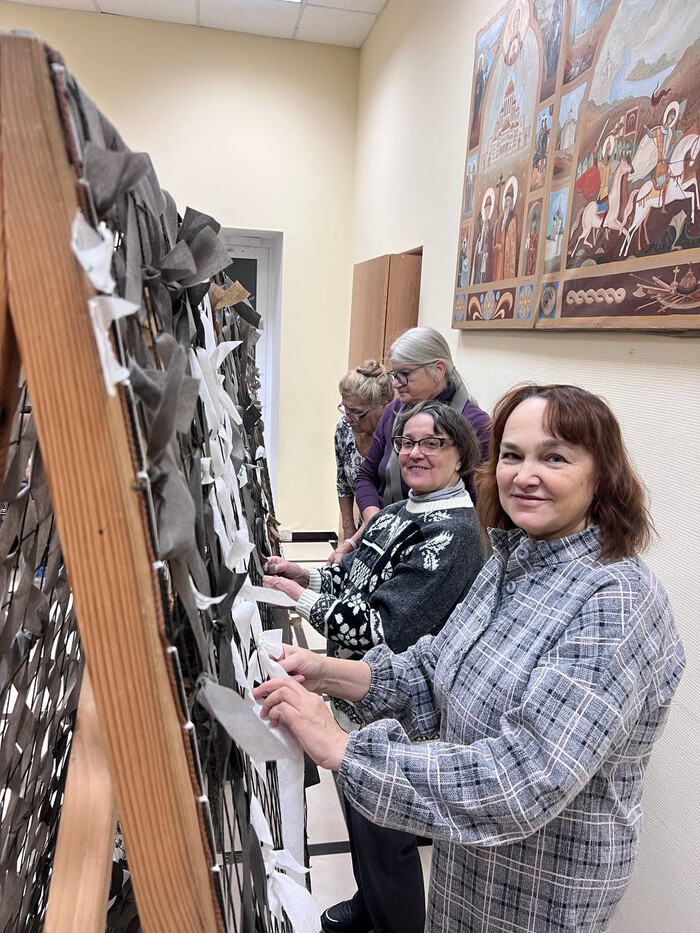 Потом начались обычные дела - плели нашу 199-ю маскировочную сеть и общались за чаем, собирали продуктовые наборы для малоимущих и искали памперсы по заявке.
