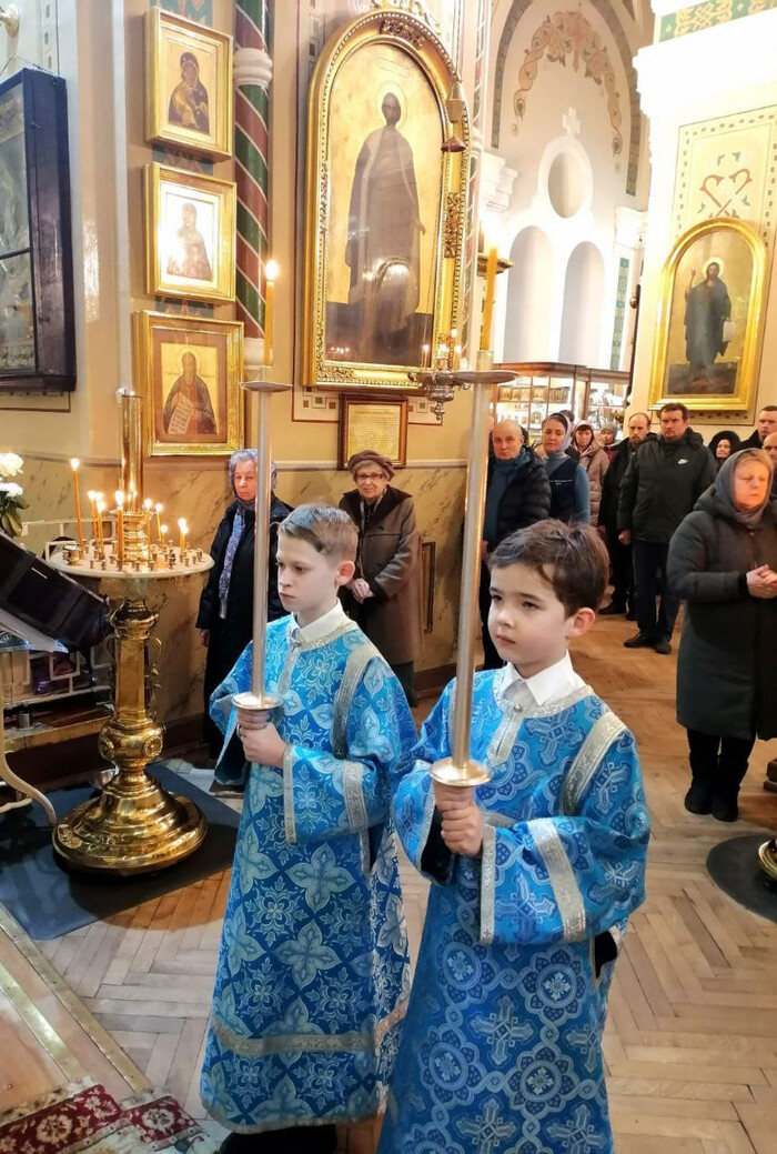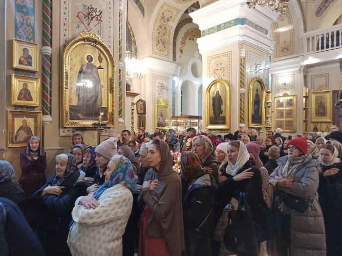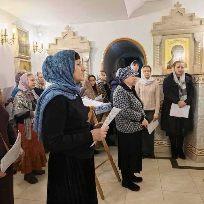На средней Литургии, отлуженной в приделе Архистратига Михаила и Небесных Сил, пели все прихожане под руководством почетного регента Спасо-Парголовского храма Ирины Ивановны Ивановой.