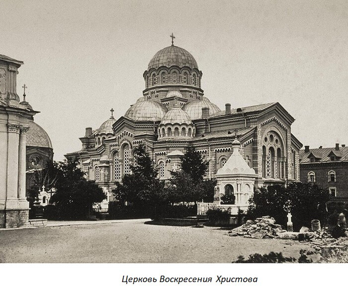 Центральным храмом монастыря стал собор во имя Воскресения Христова. В 1895 году по проекту архитектора Л.Н.Бенуа перед Воскресенским собором была построена 75-ти метровая колокольня, имеющая 4 яруса, с церковью во имя Исидора Пелусиота, очень походившая на московскую колокольню Ивана Великого.