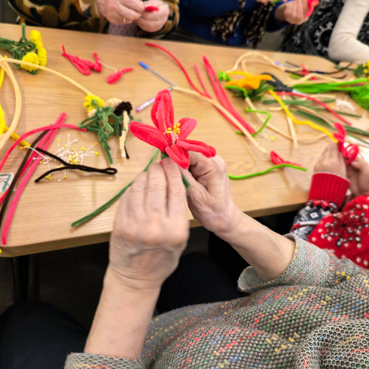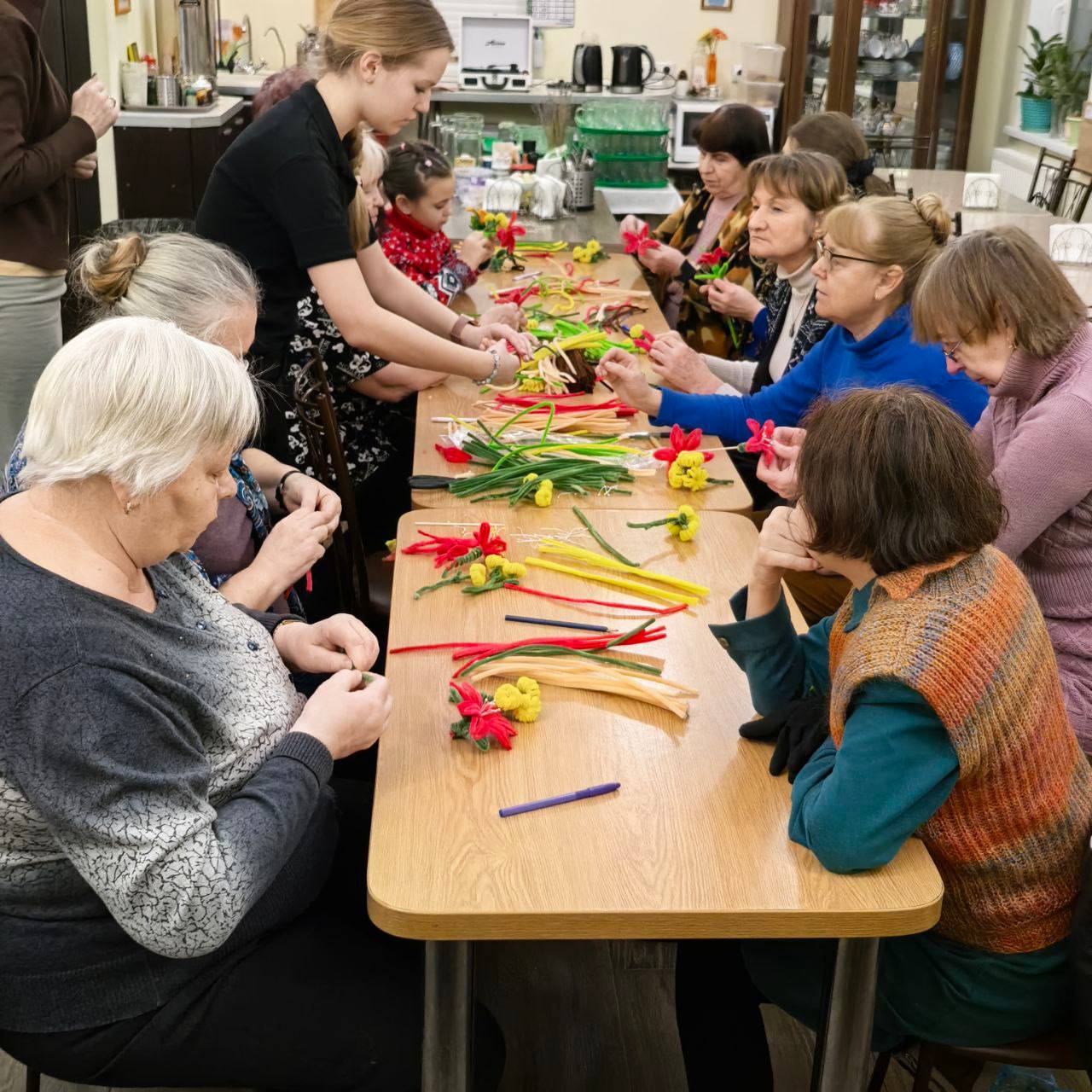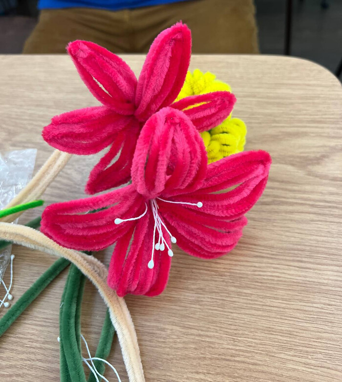 Затем в воскресной школе собрались на творческий мастер-класс - работали с синельной проволокой, создавали цветы.
