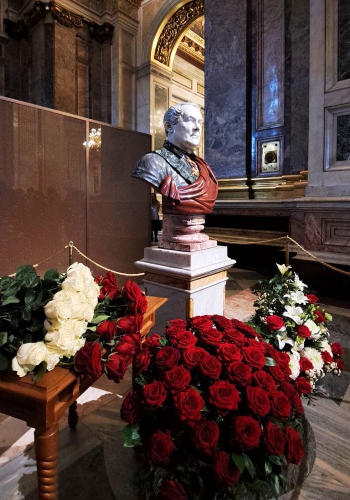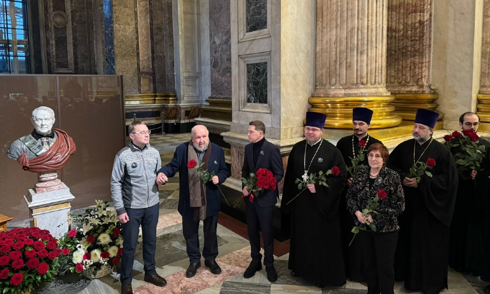 Торжественная часть праздника включала церемонию возложения цветов к портретным бюстам зодчего в интерьере Исаакиевского собора.