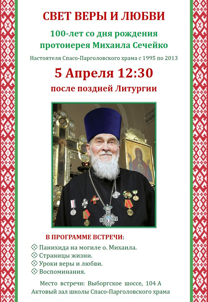 5 апреля 2026 года, в день Входа Господня в Иерусалим, исполняется ровно сто лет со дня рождения протоиерея Михаила Сечейко — человека, чье имя для многих стало синонимом подлинного пастырства. И хотя уже тринадцать лет батюшка предстоит у Престола в ином мире, его присутствие в нашей памяти не тускнеет. Оно проступает сквозь годы тем тихим и ровным светом, который невозможно забыть, однажды его встретив.