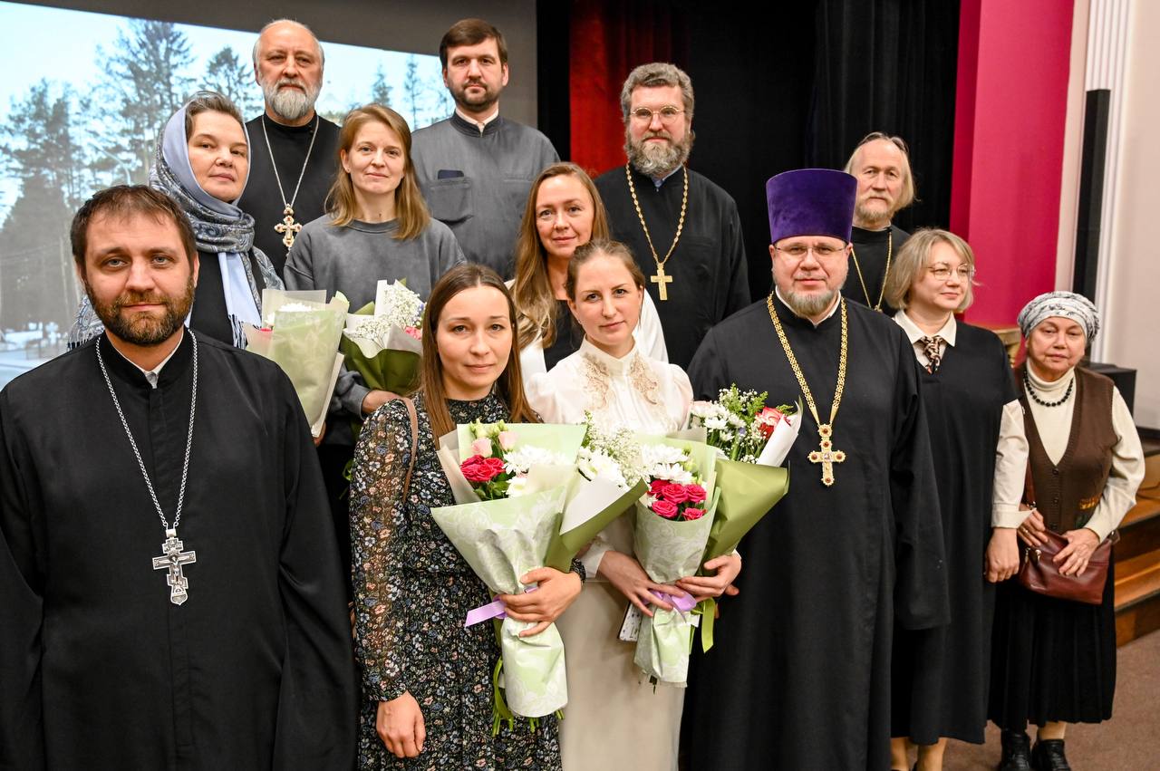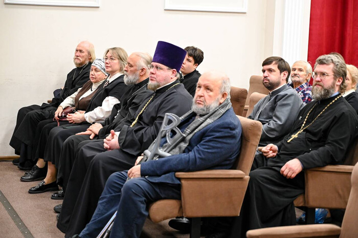 Концертный зал был полон: на просмотр собрались священнослужители и прихожане Спасо-Парголовского храма. Почетным гостем был директор ГМ "Исаакиевский собор" Юрий Витальевич Мудров.