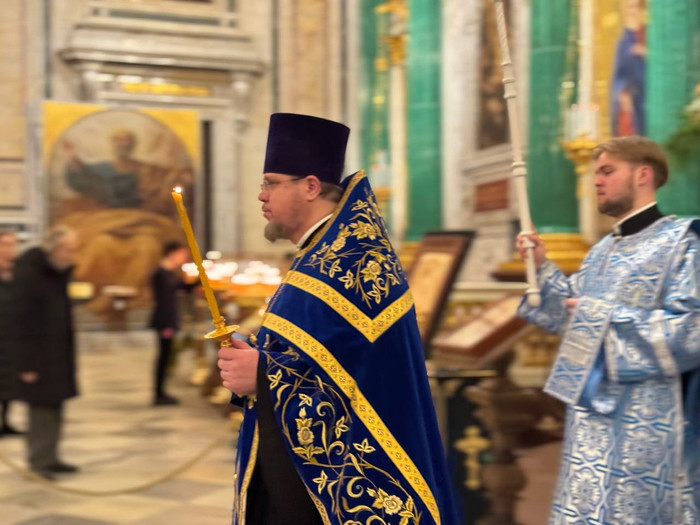 15 февраля 2025 г. протоиерей Роман Ковальский, ключарь Исаакиевского собора, настоятель Спасо-Парголовского храма и храма Всех Святых, в земле Санкт-Петербургской просиявших, возглавил Всенощное бдение в Исаакиевском соборе.
