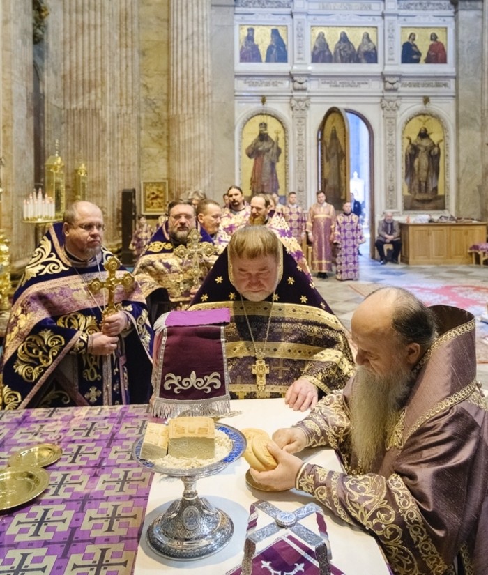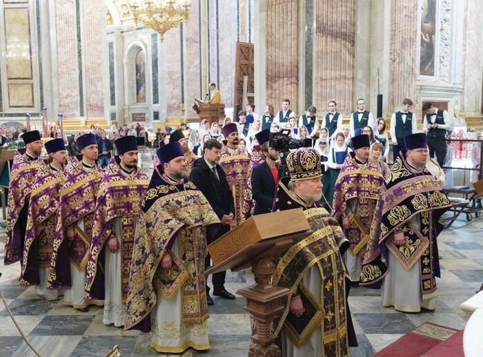 Накануне, в субботу, благочинный Выборгского округа протоиерей Роман Ковальский возглавил Всенощное бдение в Исаакиевском соборе.