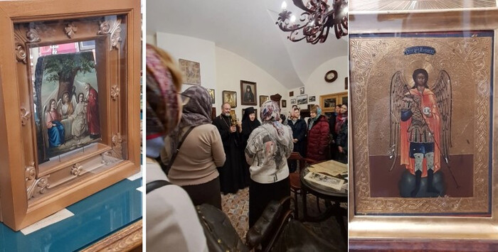 Мы помолились перед иконой архангела Михаила, принадлежавшей игуменьи Таисии. В ее записках описывается как она была чудесным образом исцелена от паралича явившемся к ней архангелом, который сказал ей: «Поезжай с Богом в монастырь, архангел будет с тобою» и перекрестил её иконой. В считанные дни ей вернулось здоровье. Это событие произошло в 1883-м. Удивительно, но в 2016-м в Леушинском подворье во время Великого поста появились люди, принесшие икону Архангела Михаила с дарственной надписью игуменье Таисии от Преосвященнейшего Анастасия, епископа и викария Новгородского, и датой – 1884 год.