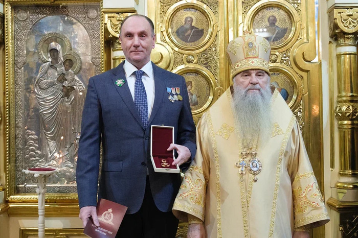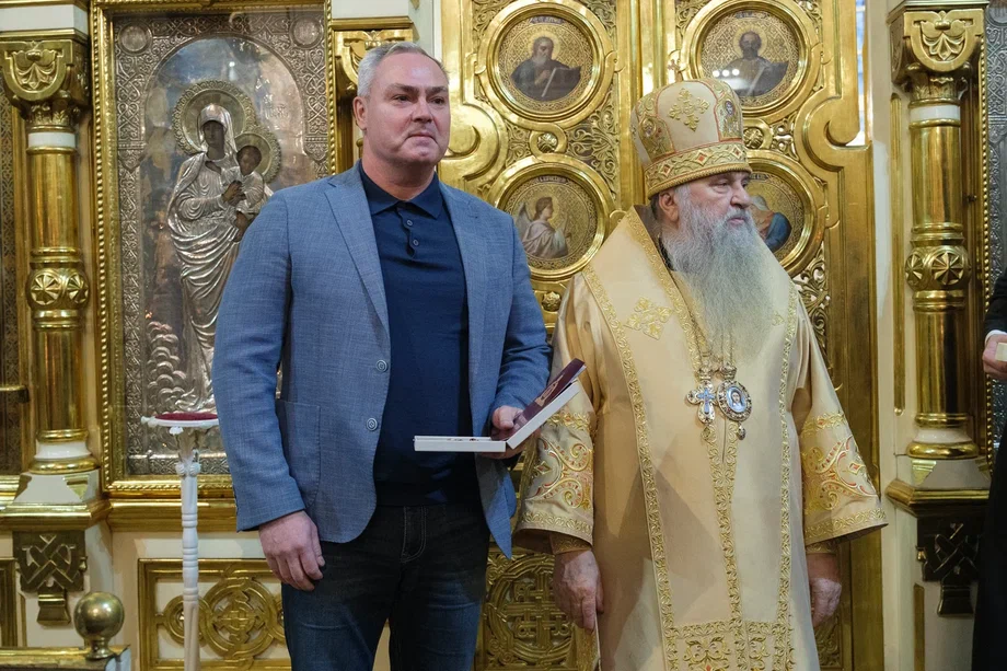 Благотворители храма Виктор Попов и Роман Хмелев были удостоены знака священномученика Вениамина, митрополита Петроградского.