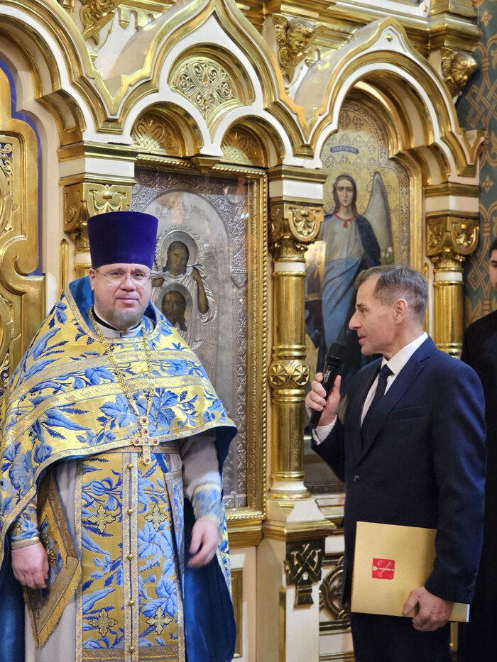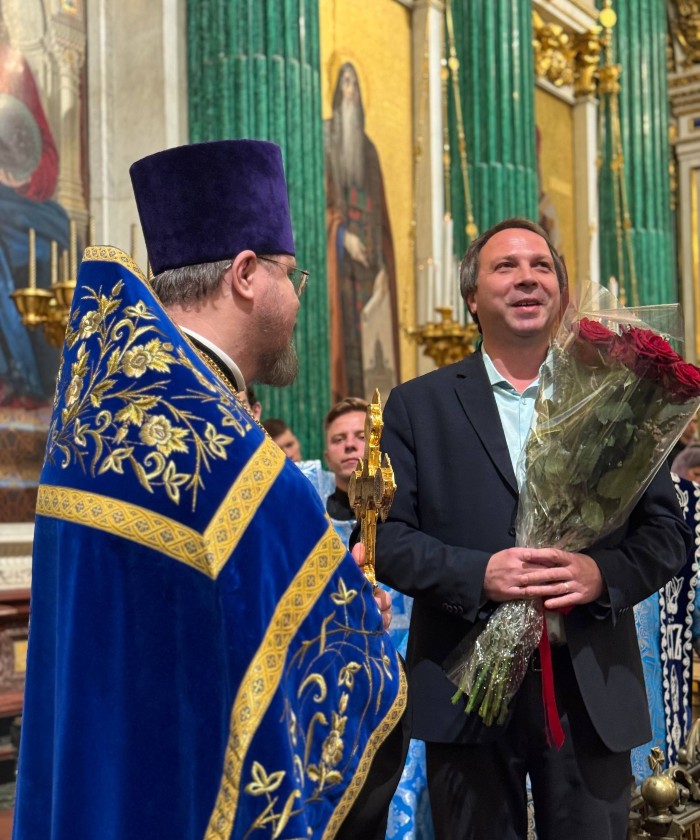 Руководитель отдела по связи с религиозными организациями администрации губернатора В. Г. Иванов огласил поздравление губернатора А. Д. Беглова, в котором отмечались заслуги о. Романа в сохранении культурного наследия нашего города, содержались пожелания доброго здоровья и успешного служения на благо всех жителей нашего города.