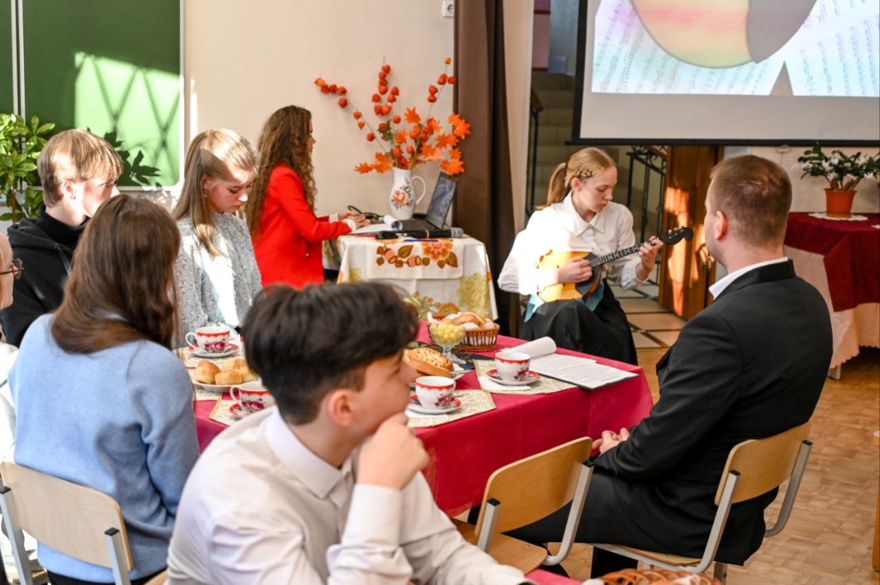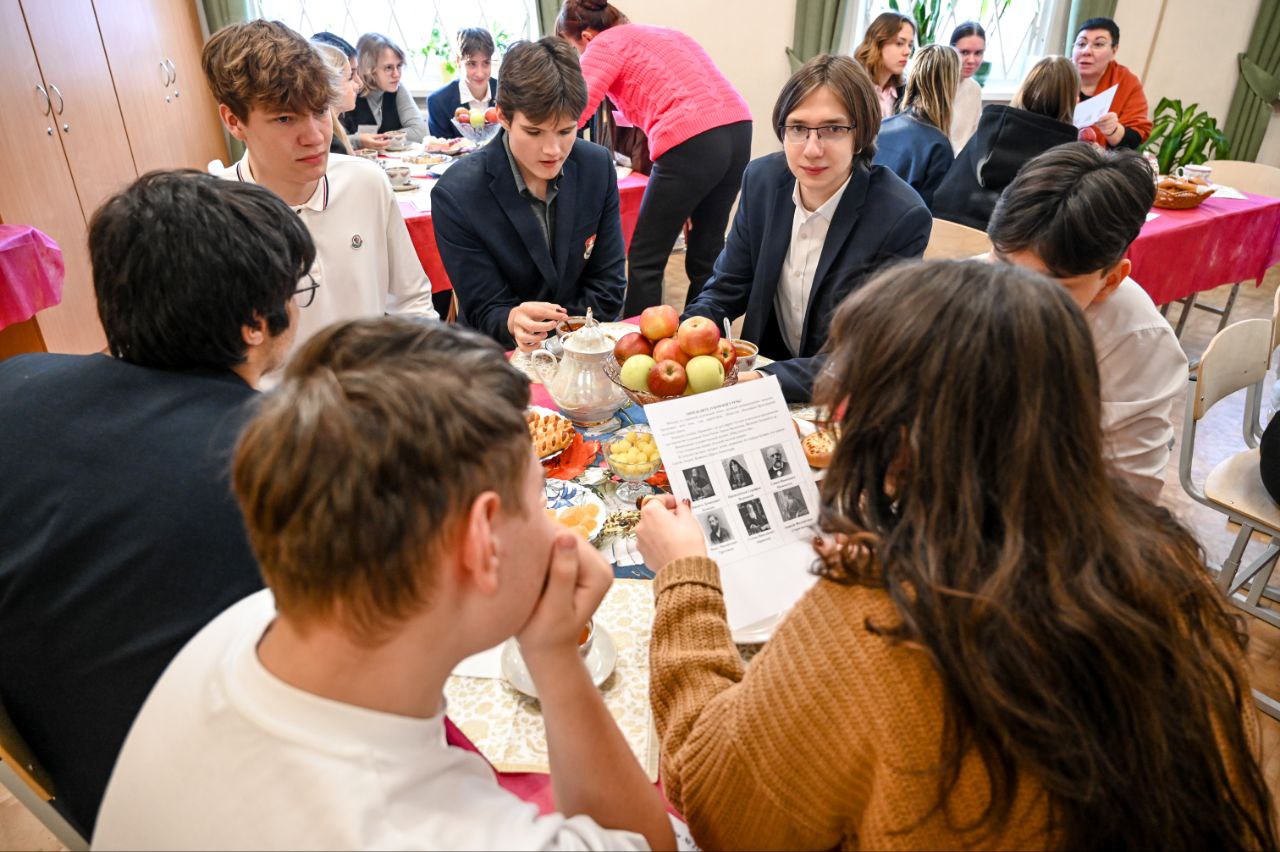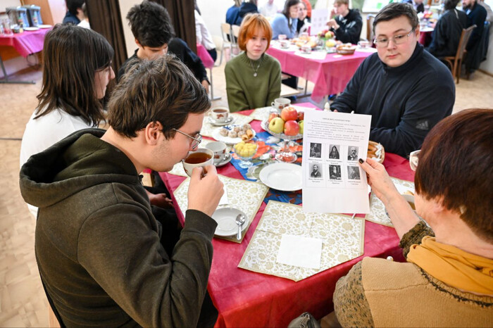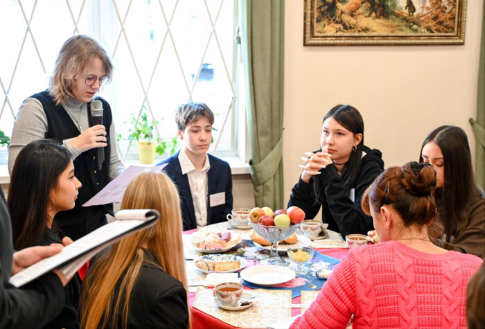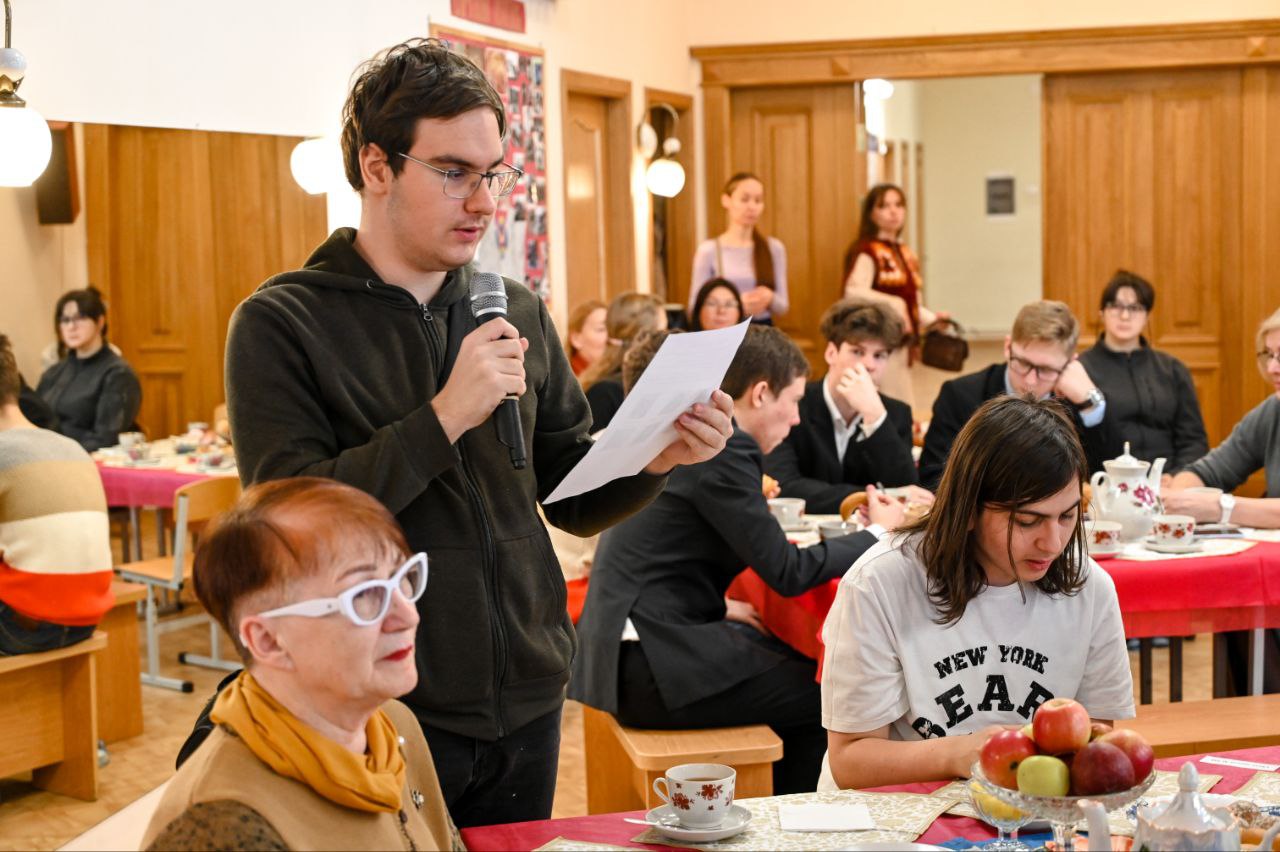 Первая часть встречи, подготовленная методистом Валентиной Арутюнян, ведущими Максимом Солодкиным и Марией Карповой, прошла в формате чаепития и погружения в традиции русского купечества.