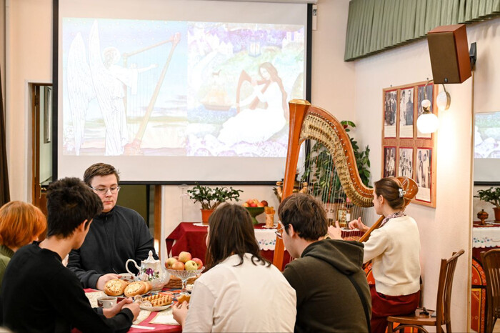Украшением первой части программы стала красивая музыка: произведения на арфе исполнила педагог музыкального отделения воскресной школы Спасо-Парголовского храма Марина Зайцева, на домре – Вера Федотченкова (преподаватель Марина Рогова).