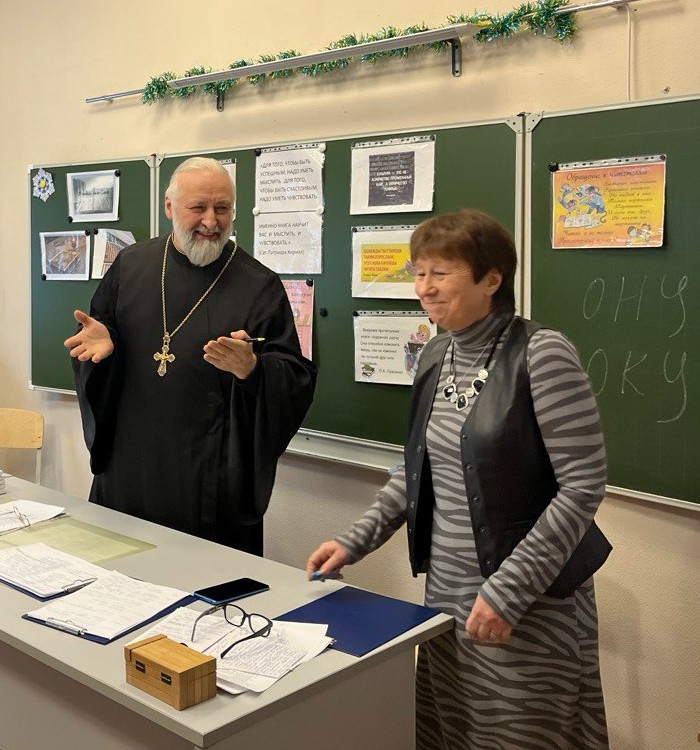 Законоучителя школы, впервые присутствующие на педсовете полным составом, присоединились к теплым пожеланиям.