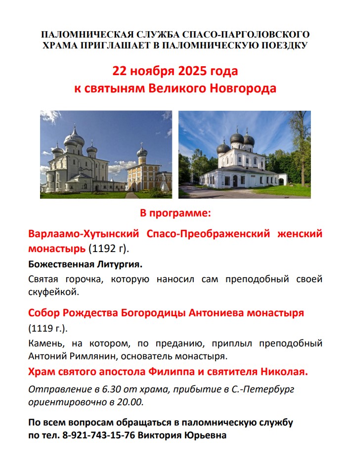 22 ноября приглашаем всех желающих в паломническую поездку к святыням Великого Новогорода!