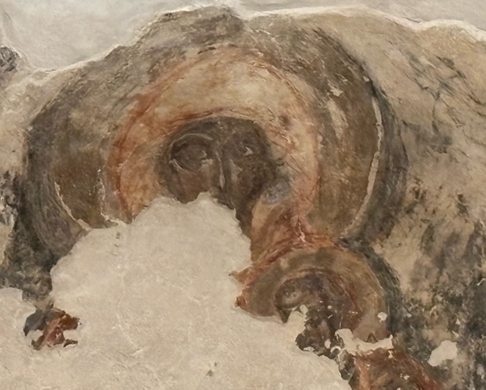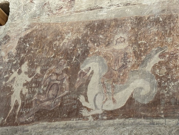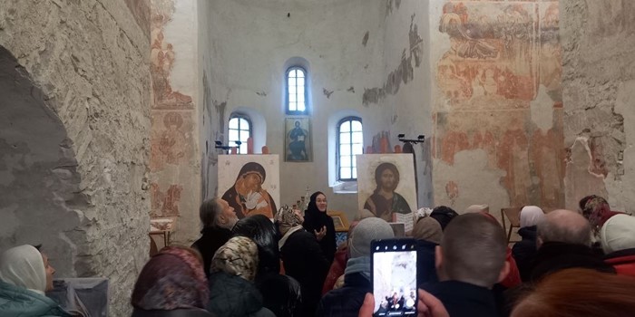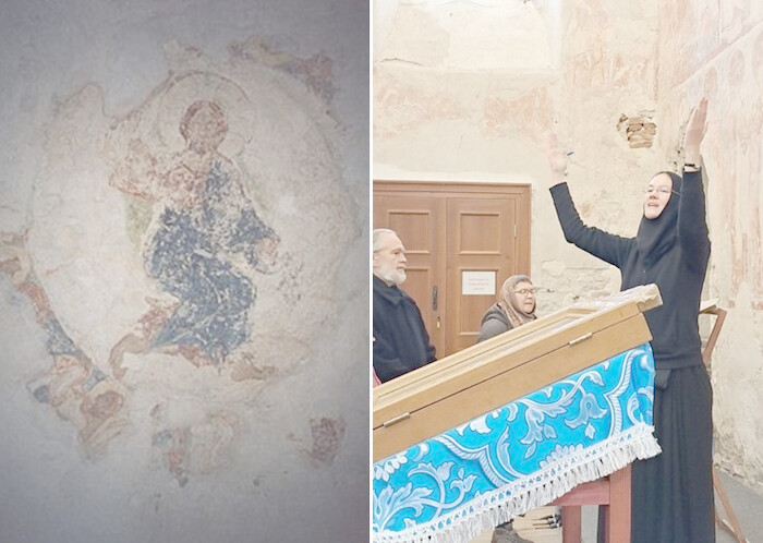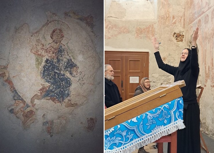 Во время экскурсии по монастырю мы побывали в соборе Рождества Богородицы. Проводившая экскурсию монахиня Валерия рассказала о работе реставраторов, частично восстановивших сохранившиеся фрагменты росписи XIV века, и подробно разъяснила их смысл и значение.