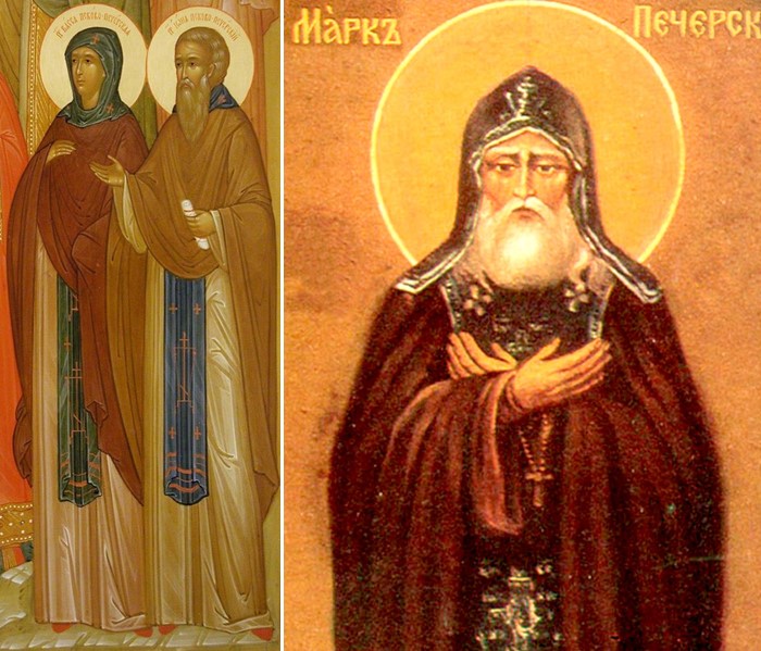 Точная дата прихода первых молитвенников, отыскавших нерукотворные, созданные Богом пещеры, и поселившиеся в них, неизвестна. По преданию это были монахи Киево-Печерской Лавры, бежавшие от набега крымских татар. Известно имя одного из них - святой преподобный Марк, называемый «начальным иноком Псково-Печерской обители. Его святые мощи почивают у входа в пещеры.