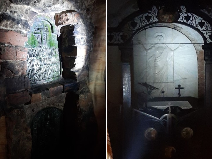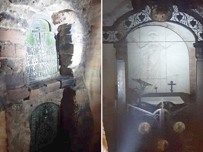 Одна из пещер закопчена огнем от свечей. Здесь, по преданию, была когда-то подземная церковь. В этой пещере упокоен настоятель обители архимандрит Тихон (Секретарев). Некоторые из нас помнят его по предыдущим посещениям Псково-Печерского монастыря.