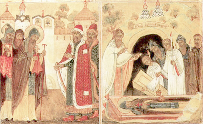 Официальной датой основания Псково-Печерского монастыря принято считать 1473 год, когда была освящена Успенская церковь, вырытая святым преподобным Ионой в песчаном холме близ ручья Каменца. Преподобный Иона (в миру Иоанн) подвизался в Ливонии, неся прослушание священника Георгиевского храма Юрьева-Ливонского. Из-за гонений со стороны немцев-латинян он вместе с семьей покинул Юрьев и поселился в Пскове. Вскоре он узнал о мучительной смерти за Веру Христову своего сослужителя - священника Исидора, который вместе с 72-мя прихожанами был утоплен в проруби реки Амовжи. Это событие сподвигло отца Иоанна прийти к «Богом зданным пещерам» и начать строительство церкви в песчаной горе. В этом ему помогала супруга Мария. Строительство церкви еще не завершилось, когда Мария заболела и, приняв монашеский постриг с именем Васса, отошла ко Господу. Отец Иоанн вместе с духовником супруги совершили её отпевание и погребение. Но гроб чудесным образом оказался на поверхности. После повторного отпевания и погребения гроб с телом Вассы неведомой силой был вновь поднят наружу. Тогда отцу Иоанну было открыто, что его супруга угодила Богу своей непорочной жизнью и добрыми делами, и потому не должна быть погребенной в земле. И ныне рака со святыми мощами преподобной Вассы находится у входа в пещеры. Там же находится и рака с мощами её супруга, принявшего монашеский постриг с именем Иона.