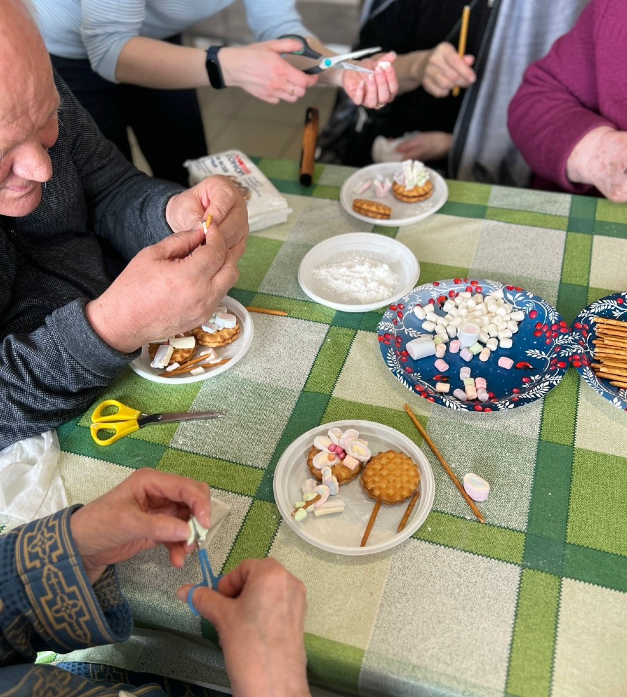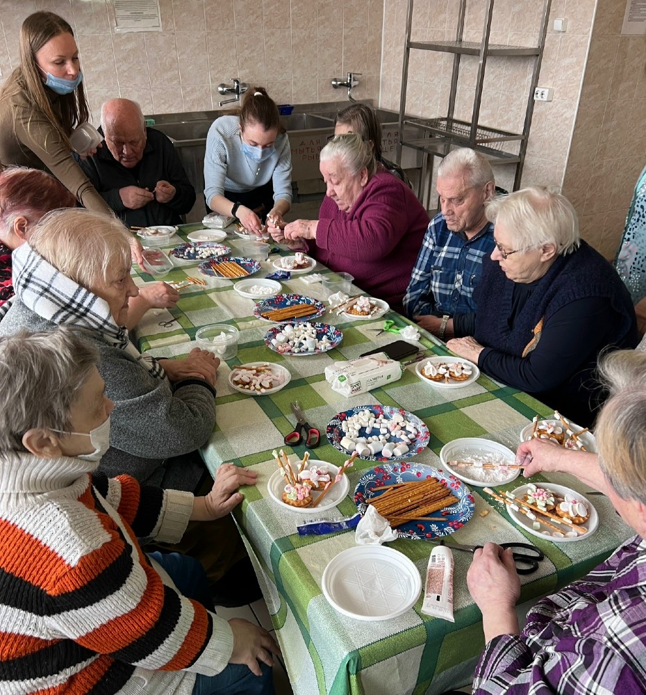 Наши творческие бабушки и дедушки любят «вкусное» творчество, поэтому в этот раз они с волонтерами лепили декор из маршмеллоу.