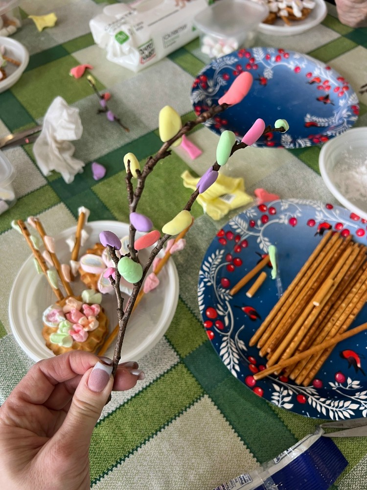 В конце встречи мы сделали из свежесрезанных плодовых веток разноцветную фантазийную вербу с использованием воздушного пластилина. Если веточки поставить в воду, то появятся молодые листья, и надеемся, нашим творческим участникам будет приятно вспомнить о прошедшей встрече.💚