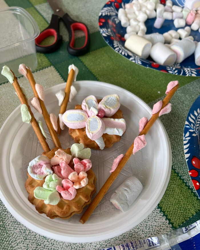Цветы, листики и съедобные веточки вербы могут быть как угощением к чаю, так и украшением для куличей. Заодно перекусили во время творческого процесса!