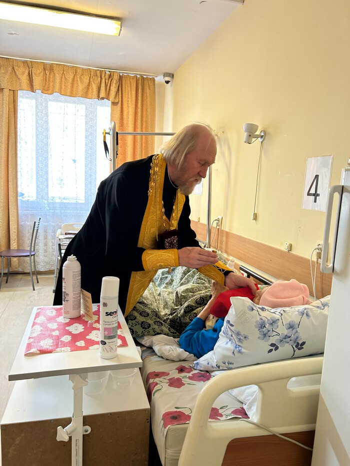 Служение проходит по чёткому графику. После отслуженного духовником сестричества прот. Ярославом Родионовым молебна о здравии «зде лежащих и служащих», всем подопечным и медперсоналу раздаём пасхальные открытки и сладости.