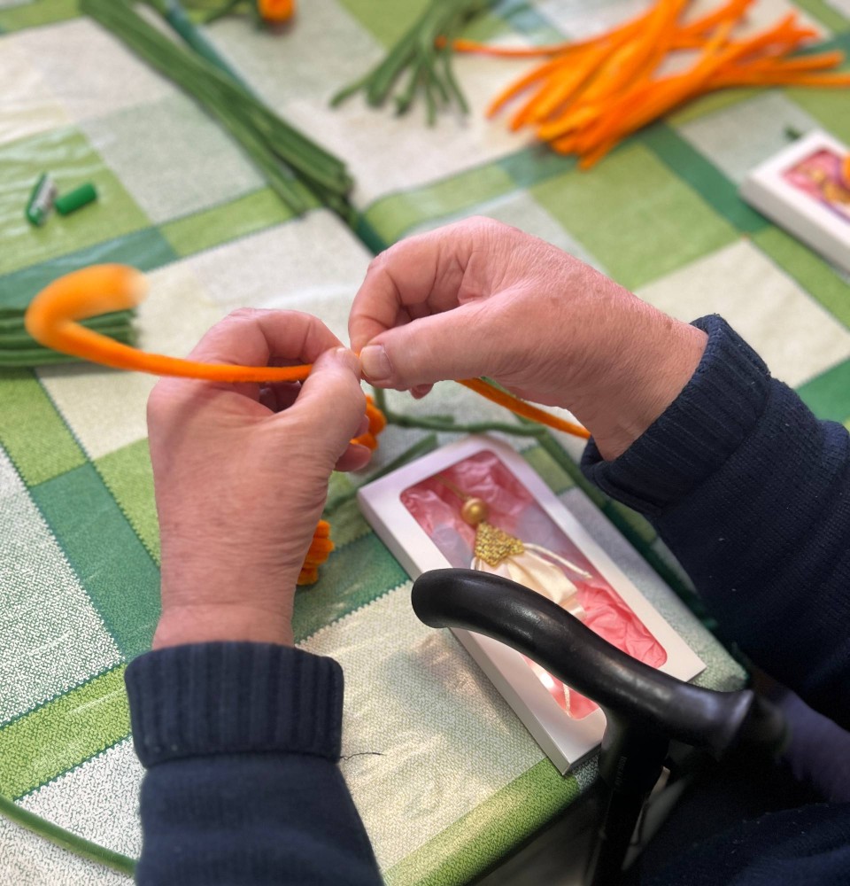 Наши творческие бабушки и дедушки быстро освоили технику и вот уже из мандариновых веточек собираются мини-букеты, а из розовых проволочек рождаются лепестки и распускаются цветы.