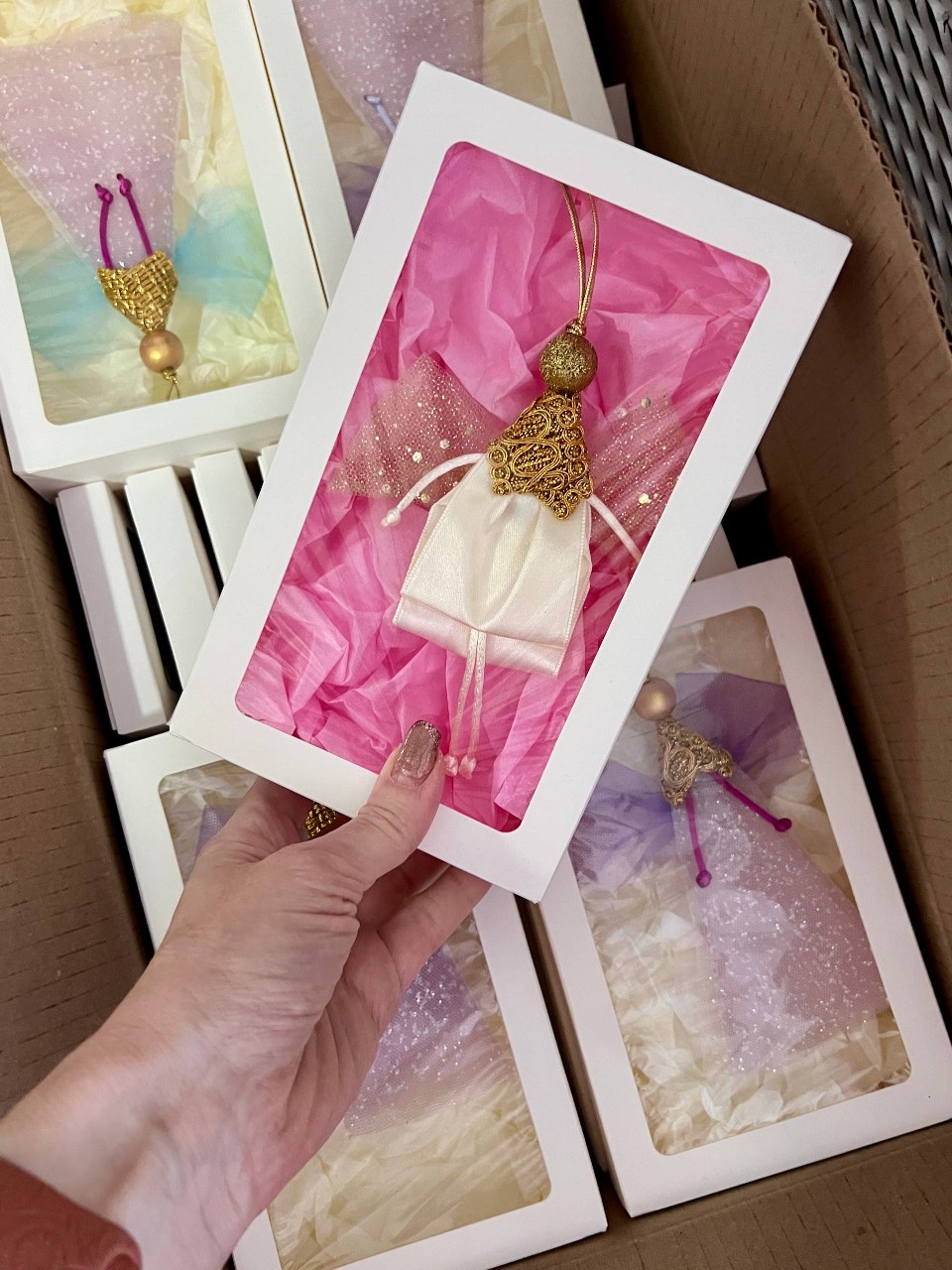 Мы сегодня пришли не с пустыми руками, а поздравили с праздниками и подарили нашим дорогим участникам красивых рукодельных ангелочков, которых передала прихожанка храма. И остальных ангелочков для подарков оставили на отделении.