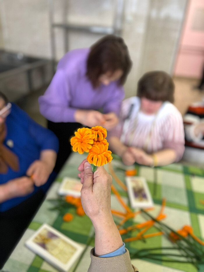 Работали с синельной проволокой - полезная мелкая моторика, цветотерапия (оранжевый цвет сам по себе заряжает энергией) и приятные осязательные ощущения от пушистого материала.
